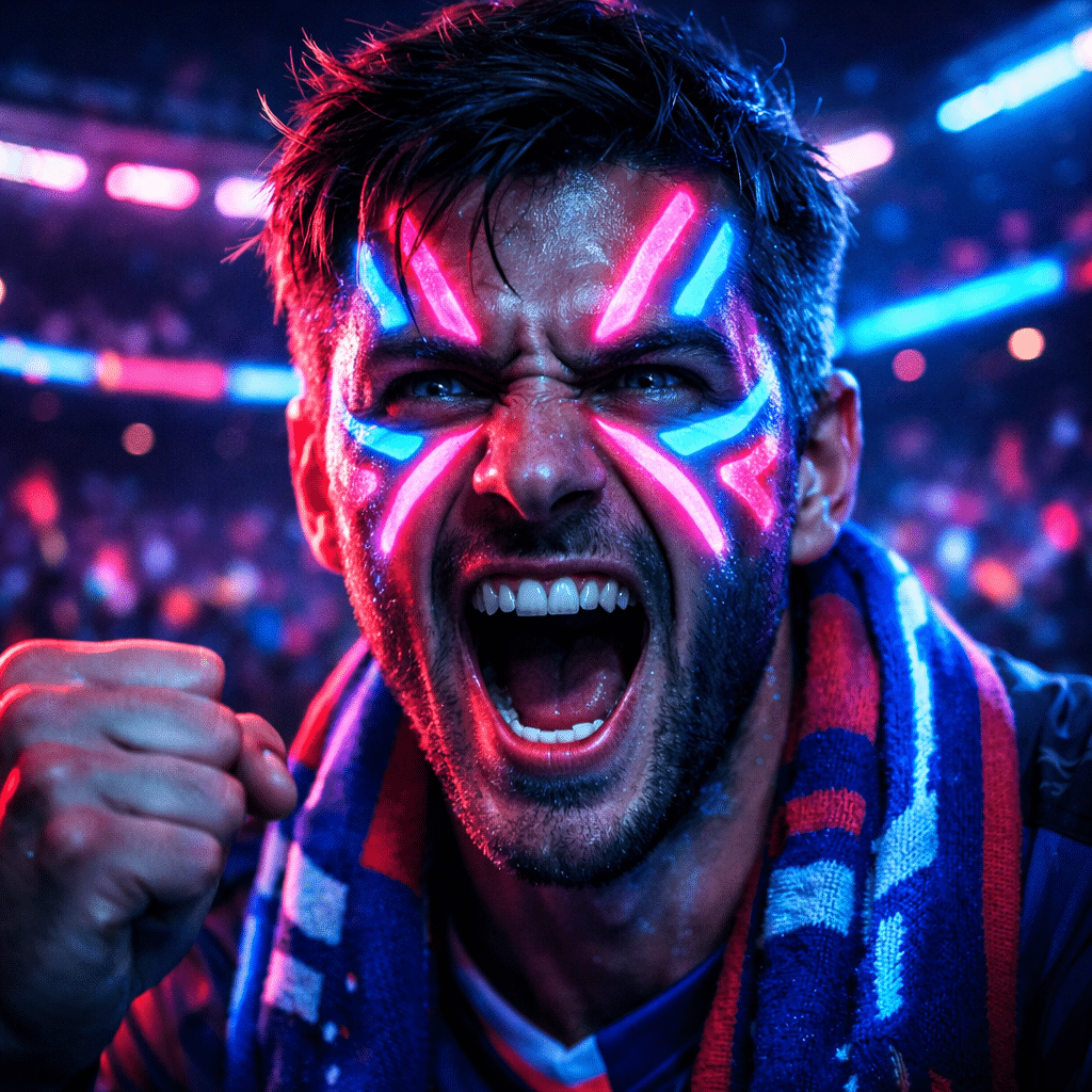 1 “Neon Face Paint” A high-energy portrait of a passionate fan featuring vibrant, glowing neon face paint patterns. Perfect for showing team spirit with a futuristic digital twist.