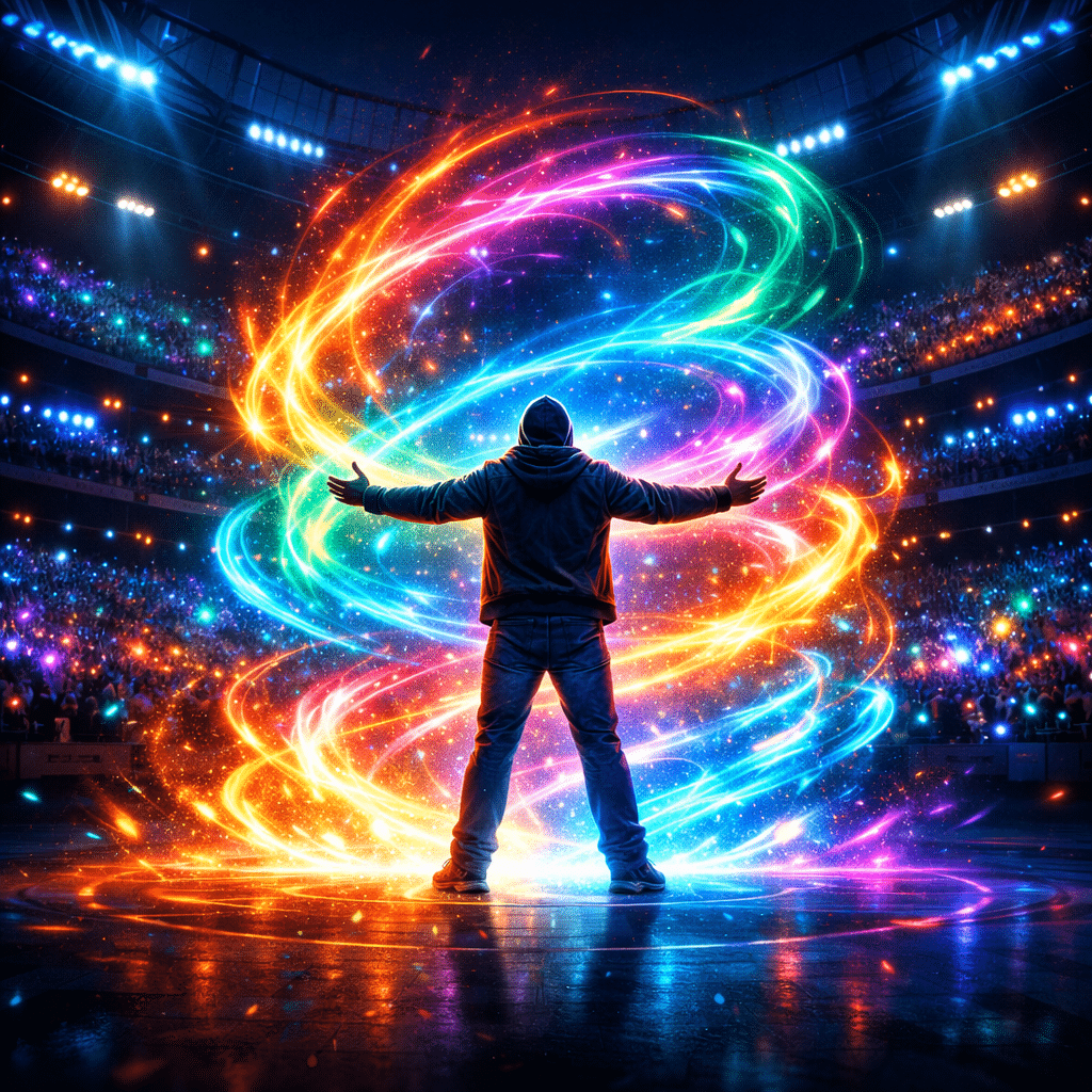 4 “Stadium Energy Aura” An epic visualization of fan passion, featuring a swirling aura of multi-colored neon energy that radiates from the user in the center of a digital stadium.